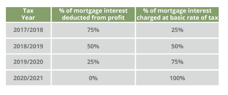The ability to claim any mortgage interest relief is being eroded gradually until 2020/2021 when all financing costs incurred by a landlord will be given as a basic rate tax reduction. The following table shows the reduction in mortgage interest rate relief and the increase in the percentage of mortgage interest used for the tax credit.